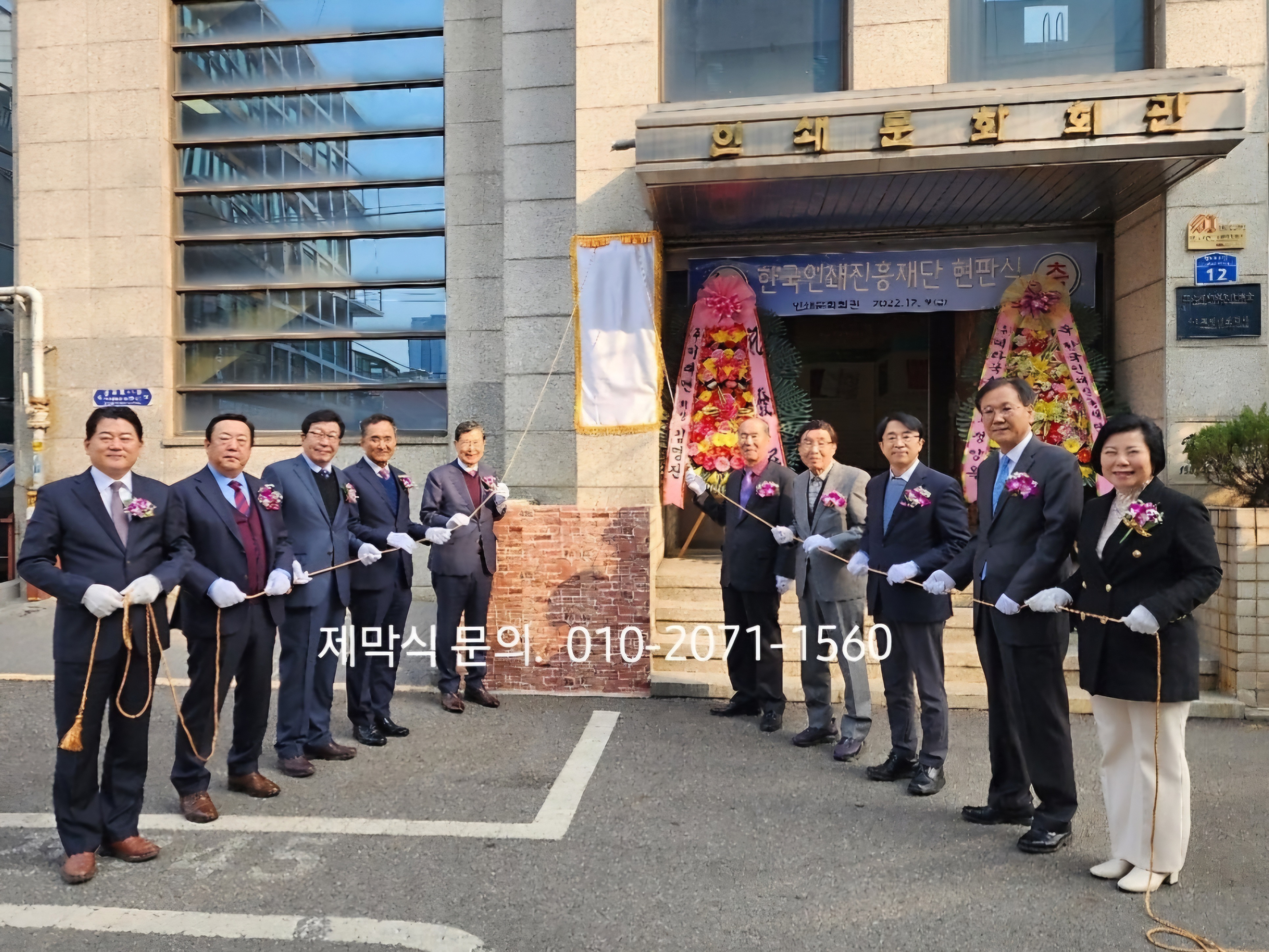 입구 간판에 제막 천을 씌우고, 내빈들이 힘을 모아 줄을 당겨 제막을 할 때에