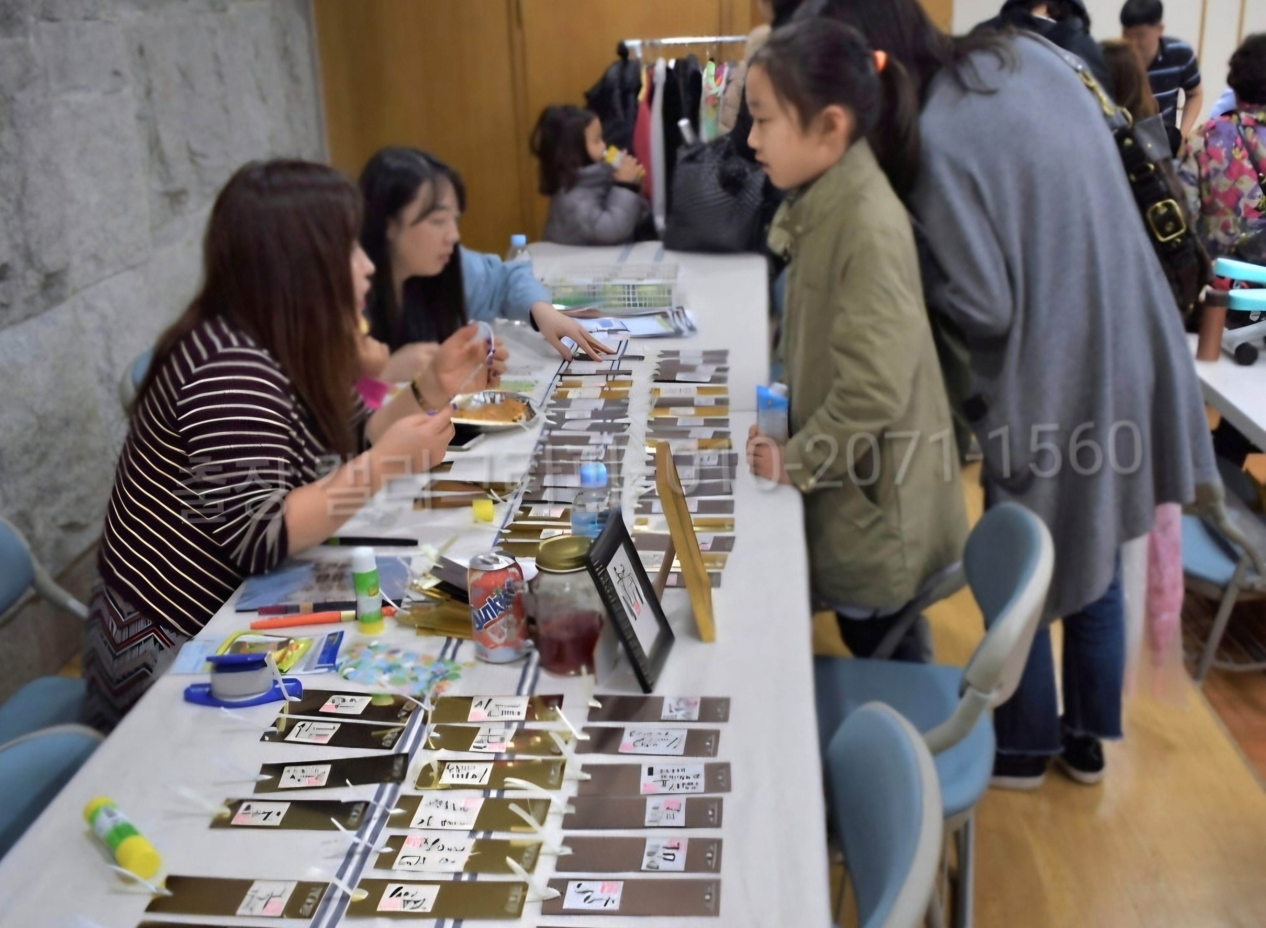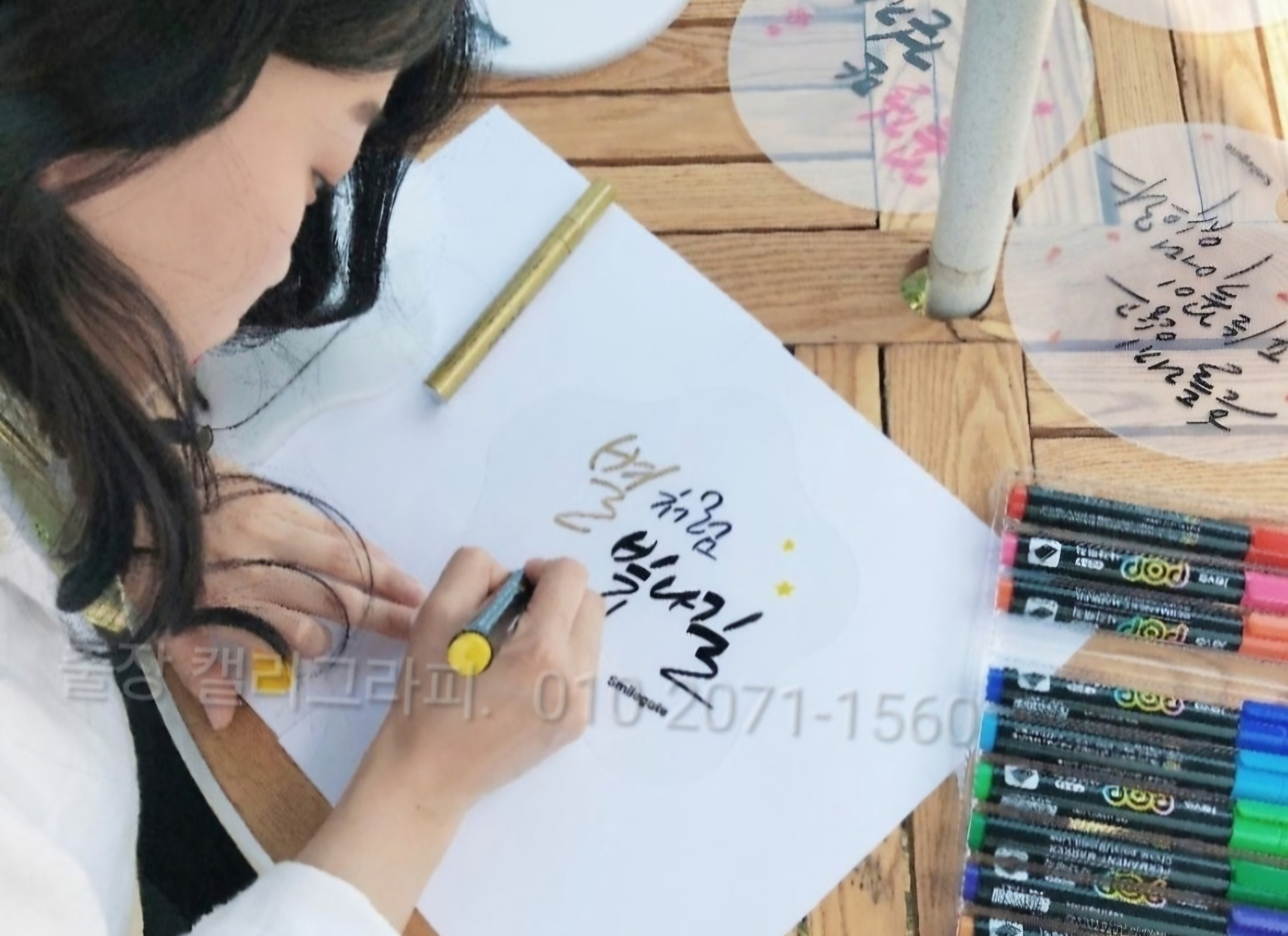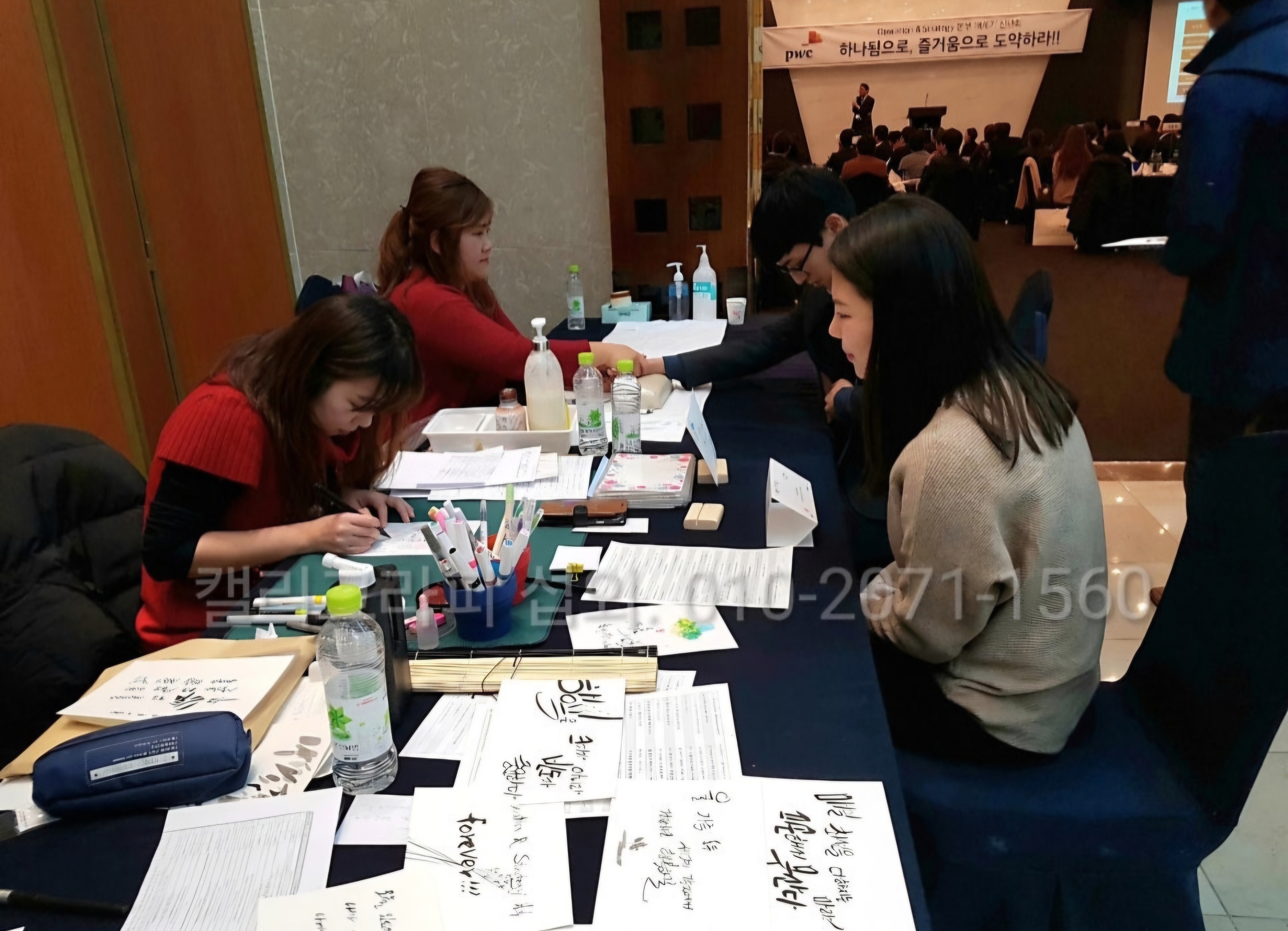 참여자들이 캘리그라피 작가들에게 약간의 코칭을 받아서 즉석에서 짧은 시간 내에 캘리그라피 작품을 만들어보는 캘리그라피 체험,