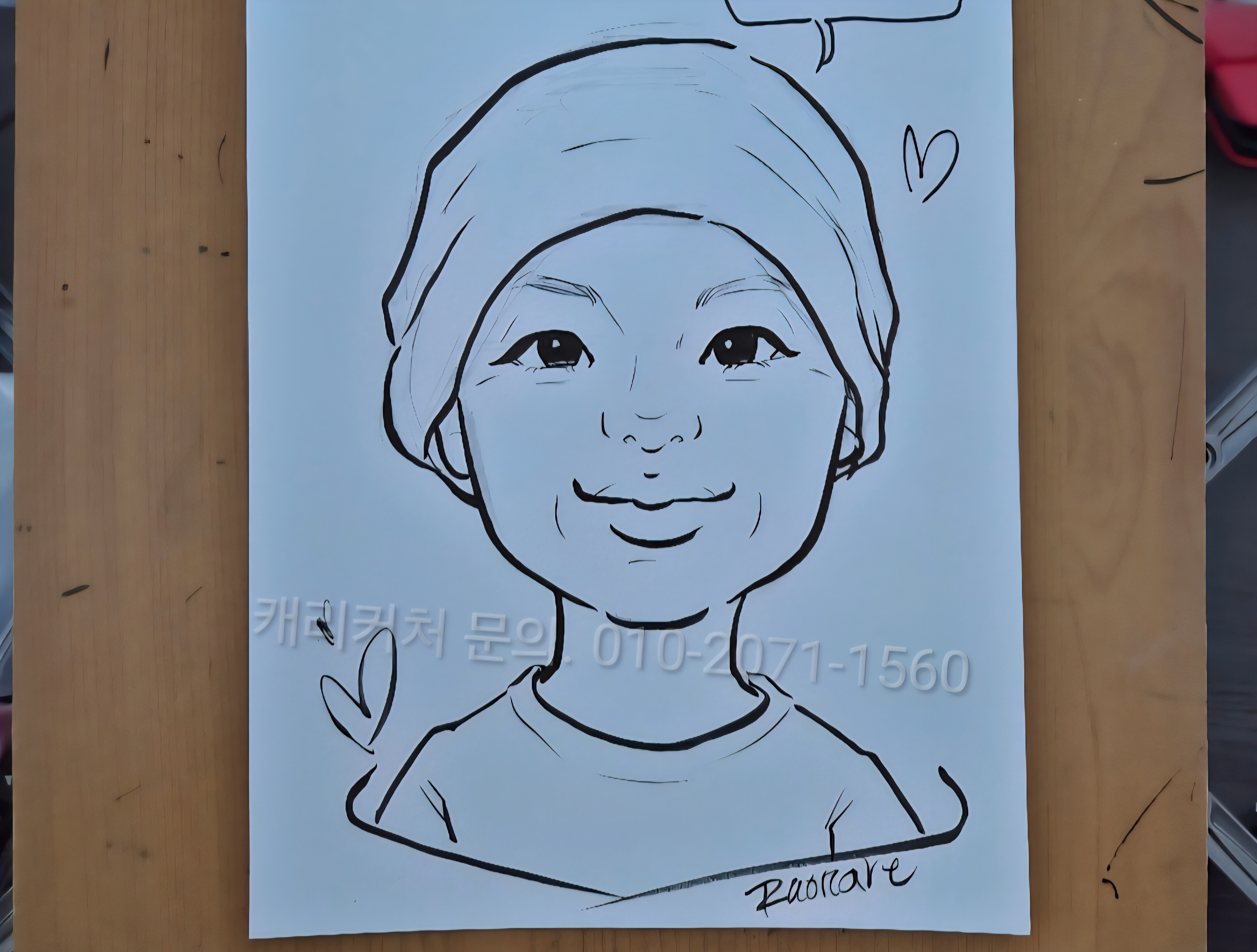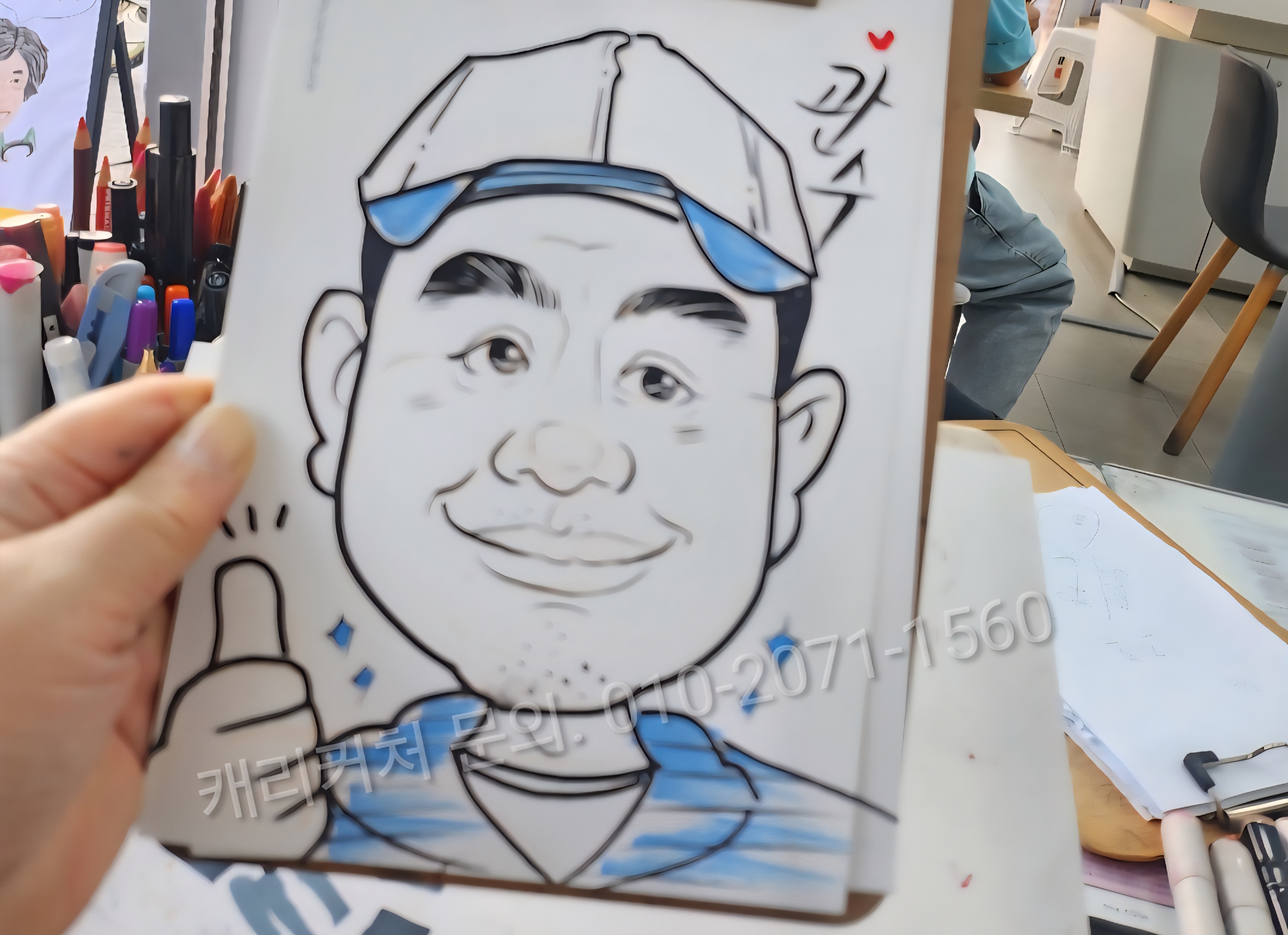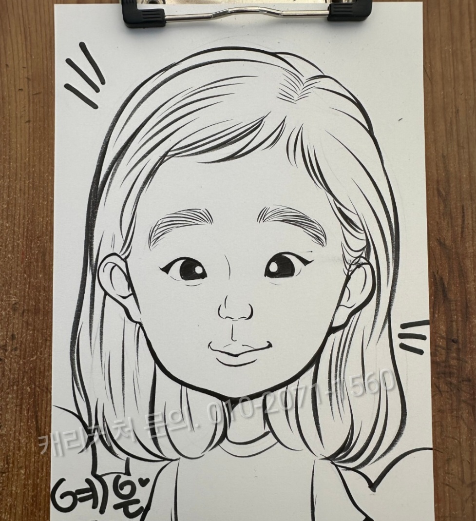 1분 캐리커쳐는 일반적인 방법은 아니며, 5~6분 동안 참여자의 모습을 지속적으로 확인하며 비슷하게 혹은 닮게 그려냅니다