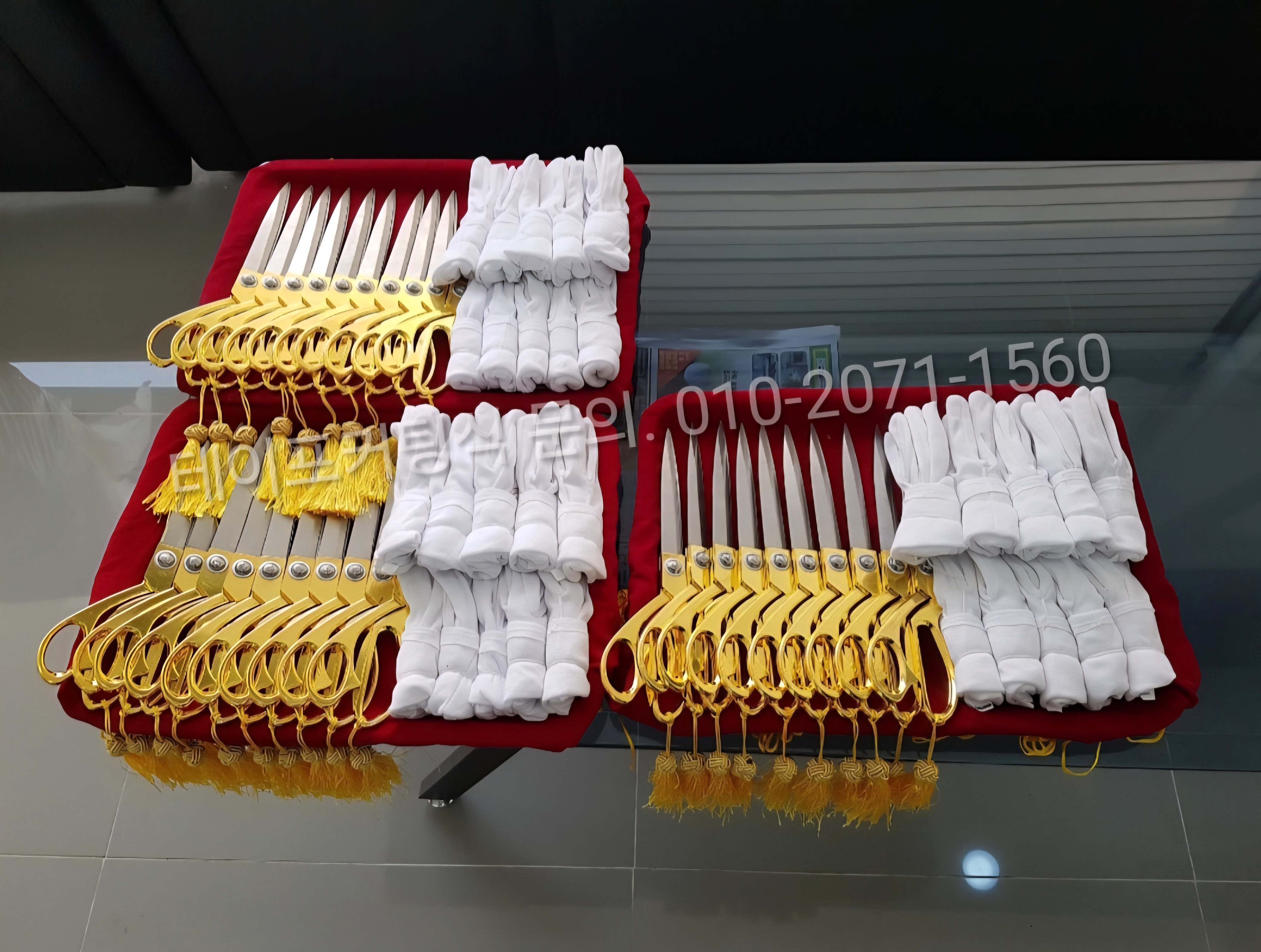 쟁반에 쟁반덮게를 씌운 후, 금장가위 흰장갑만 놓으면 되니